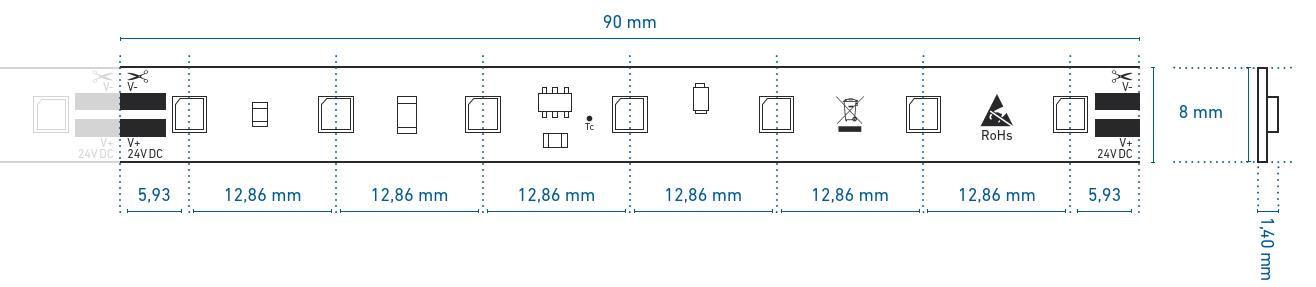 System: CV Farbtyp: white LED/Meter: 78/m Pitch: 12 Rollenlänge: 504 cm Schnittlänge: 9 cm Anschlussart: Löten Anschlussart: Stecker Abstrahlwinkel: 120° Dimmbar: ja Farbkonsistenz: 3 Binning: 1 Max. Gehäuse-Temperatur: 80° Schutzart: IP00