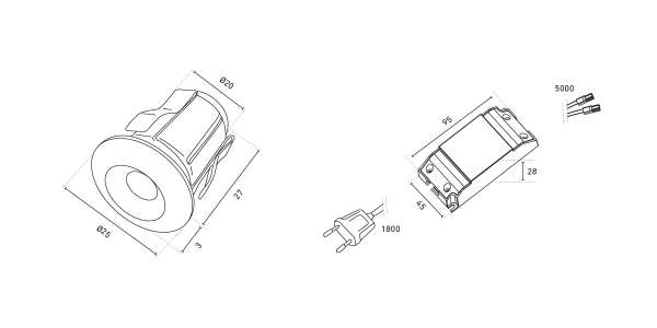 installations- und einbaufertiges Komplett-Set, bestehend aus: Sechs dekorativen, dimmbaren (Phasenan- bzw. Phasenabschnitt) LED-Downlights, einem Netzteil (CC-Konstantstrom) sowie den erforderlichen Verlängerungs- und Anschlusskabeln