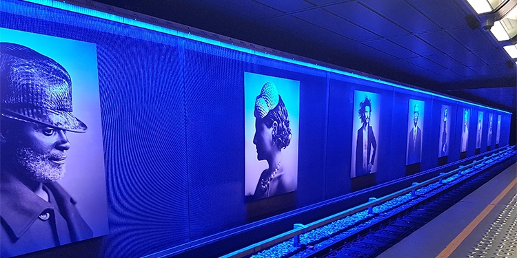 Wallwasher der BERgamo-Serie illuminieren Kunstwerke in der West Station der Metro in Brüssel. Die Leuchten sind schattenlos auf eine Länge von 90 m aneinandergereiht.