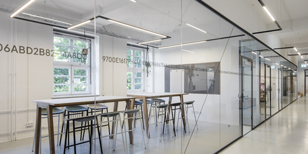 Individuell gefertigte Linearleuchten von Barthelme inszenieren die abwechslungsreiche Innenarchitektur des Kooperations- und Veranstaltungsraumes „FULL NODE“ in Berlin.