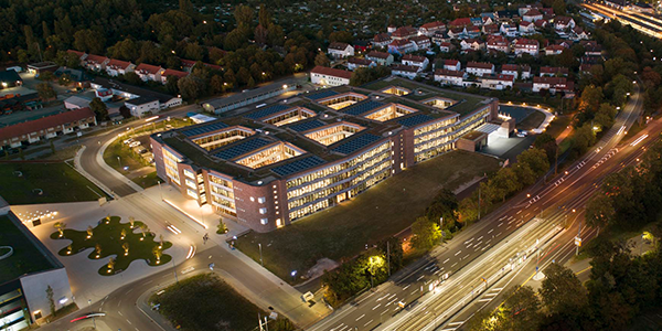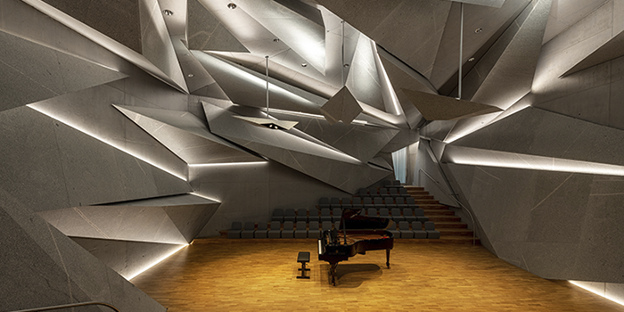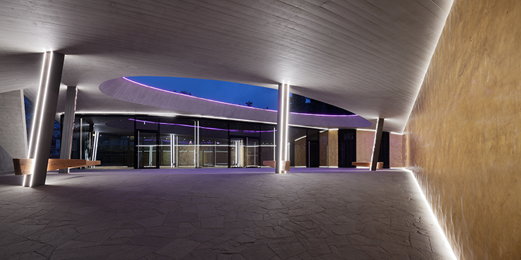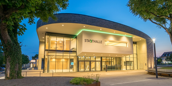 Individuell gefertigte LED-Linearleuchten von Barthelme illumieren die mit dem German Design Award 2018 ausgezeichnete Stadthalle in Bad Neustadt an der Saale.