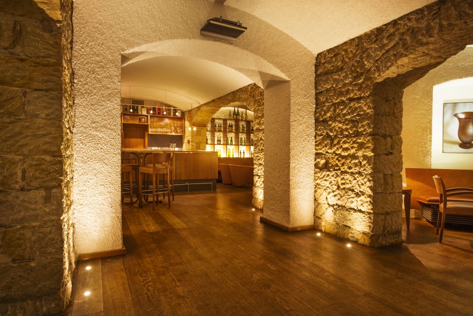 Im Weinkeller werden LED-Bodeneinbauleuchten zur stimmungsvollen Inszenierung des Gewölbes eingesetzt. Die dezenten und effektvollen Leuchten des Modells Pisa 1.2 werfen einen definierten Lichtkegel an die rauen Burgwände. Gewählt wurde hier eine 34° Optik, welche die Dimensionen des Mauerwerks perfekt einfasst und sie zu einem echten Blickfang macht.